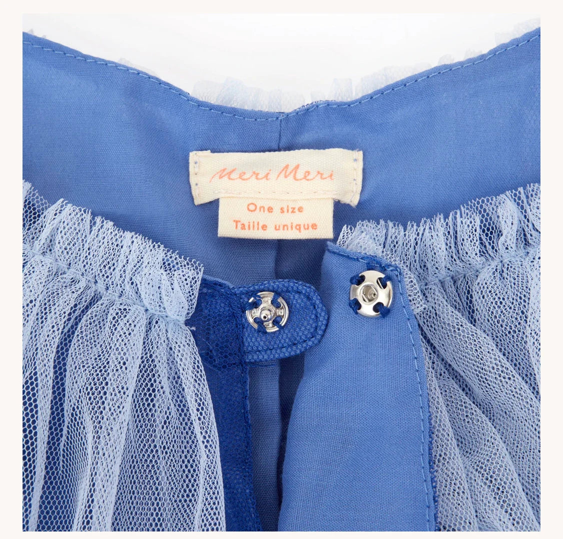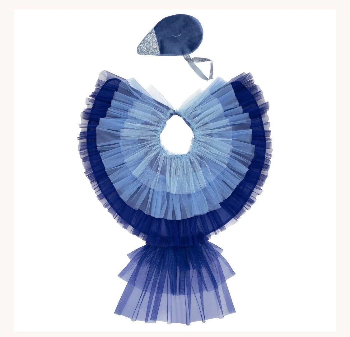 - The winged cape, with a delightful tail detail, is crafted from blue lined layered tulle