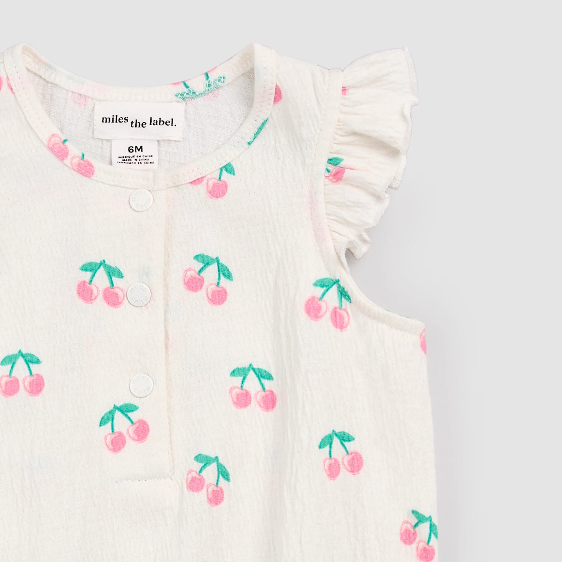 Sweet as cherry pie, this flutter-sleeved romper has an all over Cherry print and frilly finish on the legs. Made with organically grown cotton crinkle jersey, the romper is ultra soft and breathable for the warmer days. Snap buttons along the legs and a button placket on the front provides ample ways to make dressing and changes a total breeze.