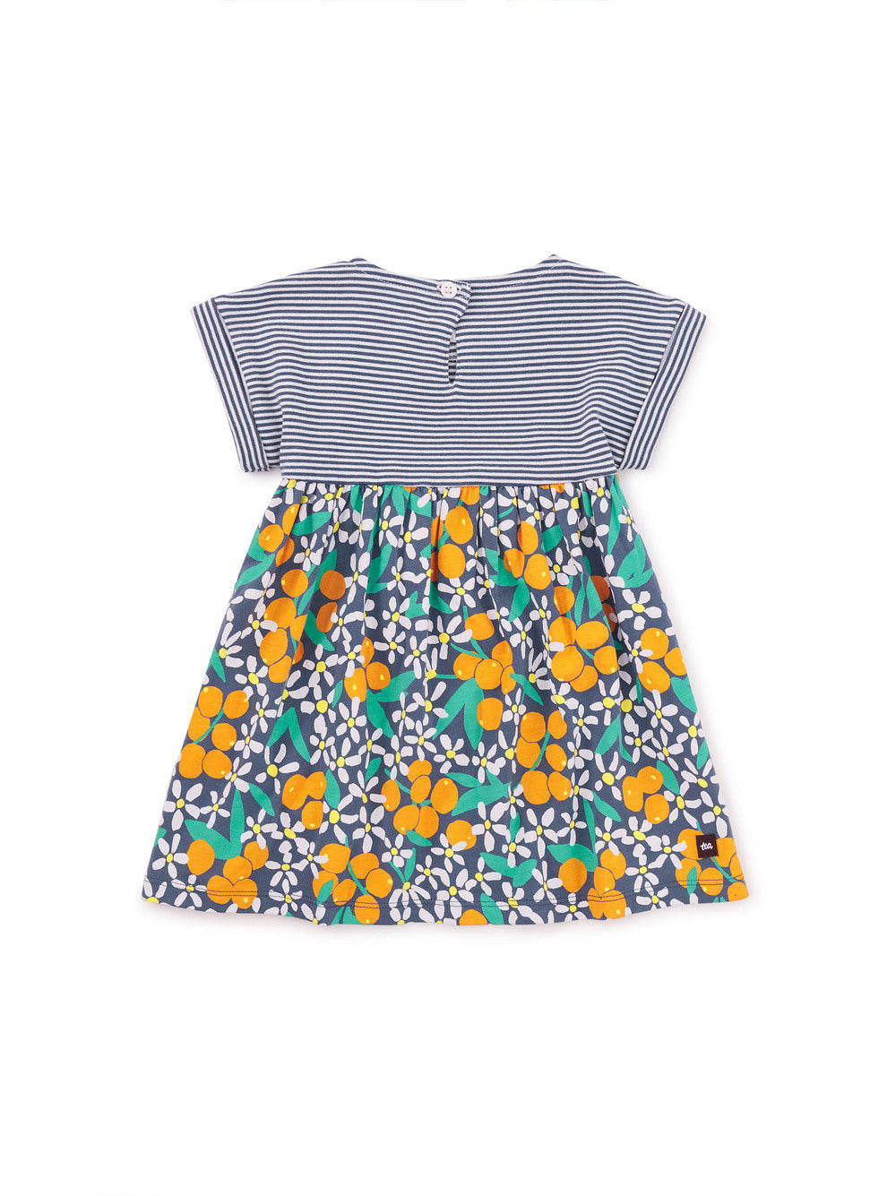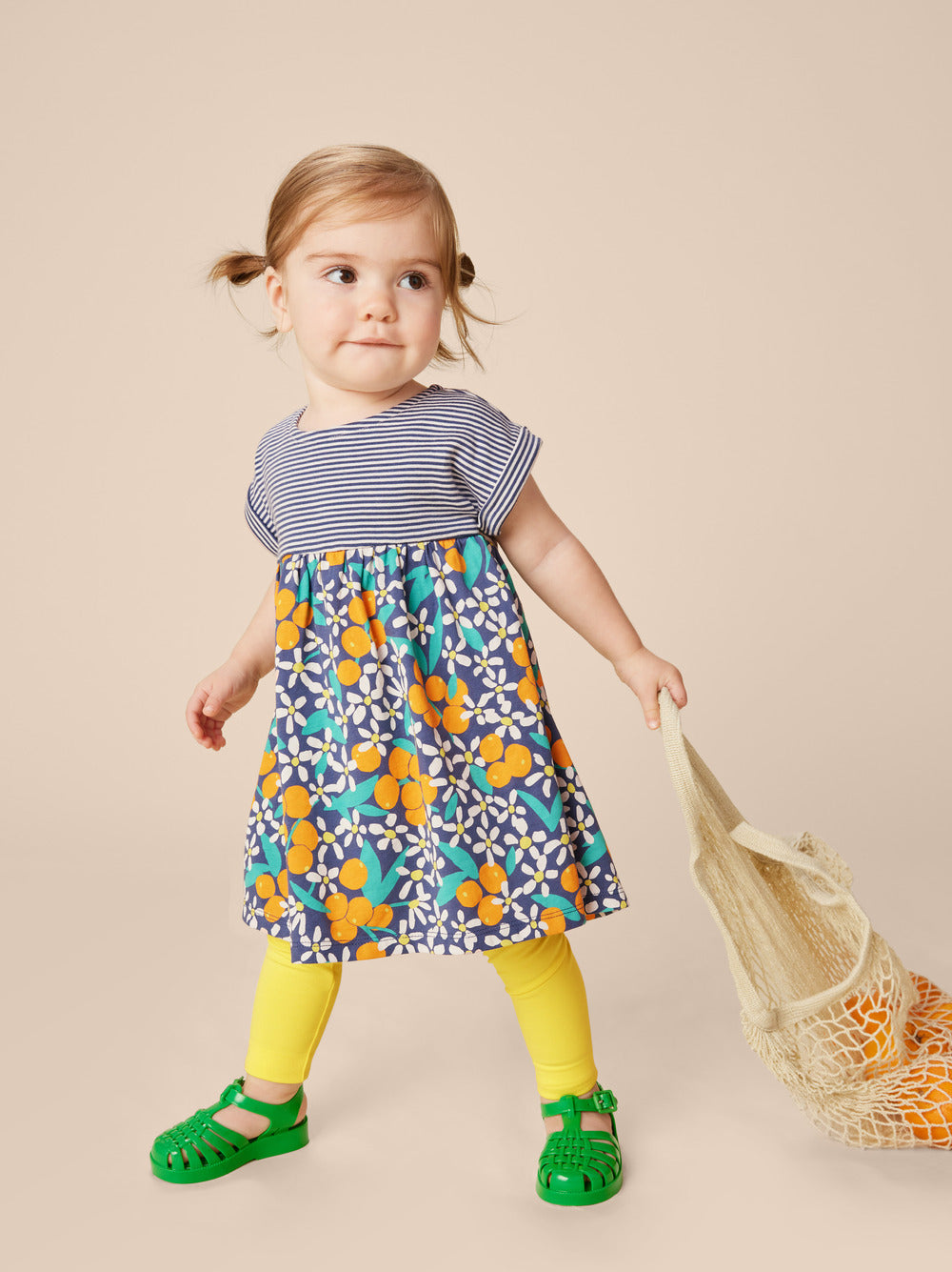 Stripes on top, florals below, and beauty all around! This chic two-print dress effortlessly ups the fashion game--featuring stylish details like a raised empire waist and cuffed sleeves. Plus, the design is made for happy twirling! Pair with leggings or somersault shorts for an easy-to-wear warm weather outfit. Crafted from 100% soft cotton jersey.