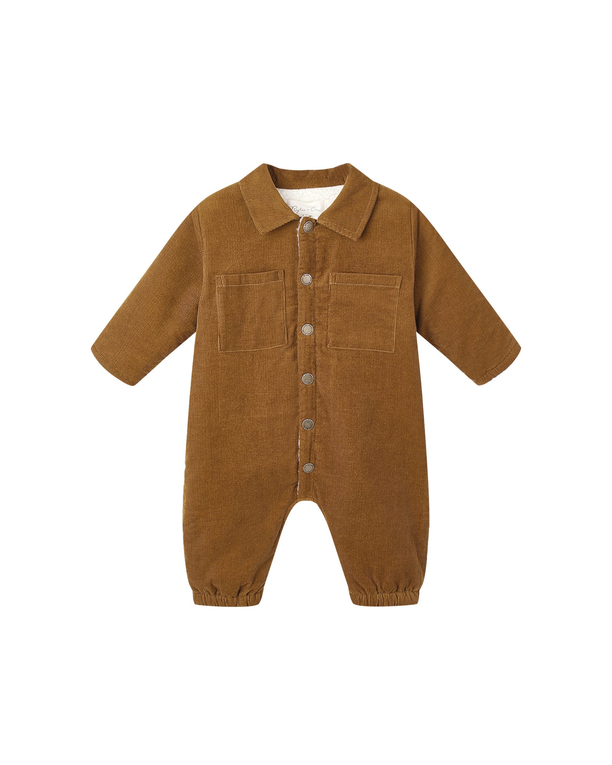 A must-have for chilly days, this cozy corduroy jumpsuit is lined in soft shearling for added warmth. Designed with a sweet collar, front patch pockets, elastic leg openings, and front buttons for easy layering.