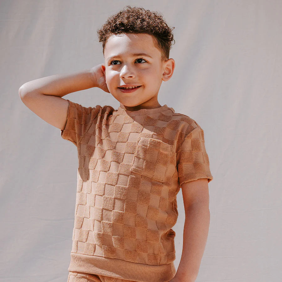 This soft-feel, terry cloth top has short sleeves with dropped shoulders for a carefree style. The top is embossed and matches the shorts from the same range to create a simple outfit set with a subtle checkerboard pattern. Made with organically grown cotton, the top is light and breezy, ensuring he’s kept cool through the summer’s hottest days.