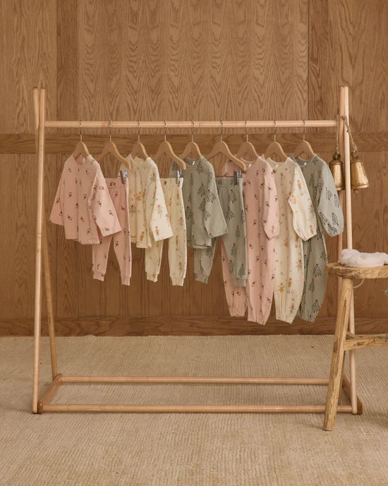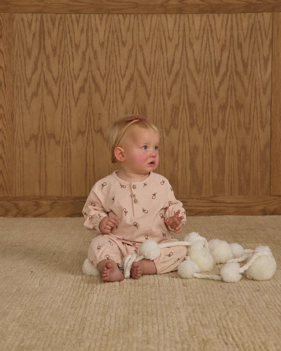 Our Henley Jumpsuit features a bubble silhouette with elasticized wrist and ankle openings, a two-button front placket, and bottom snaps for easy changes.