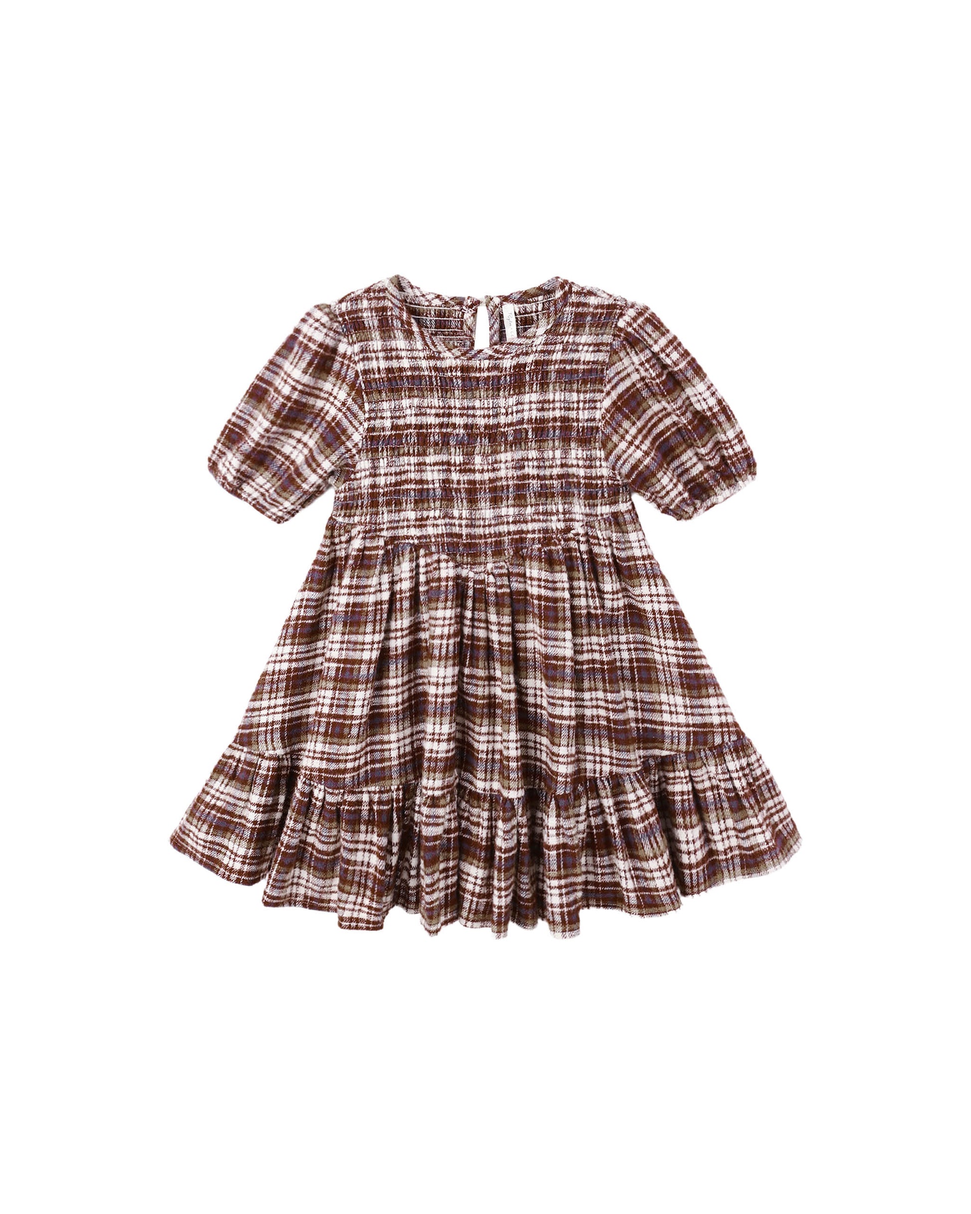 Our India Dress features a smocked bodice, a gathered V-waistline, and a flowing gathered bottom tier.