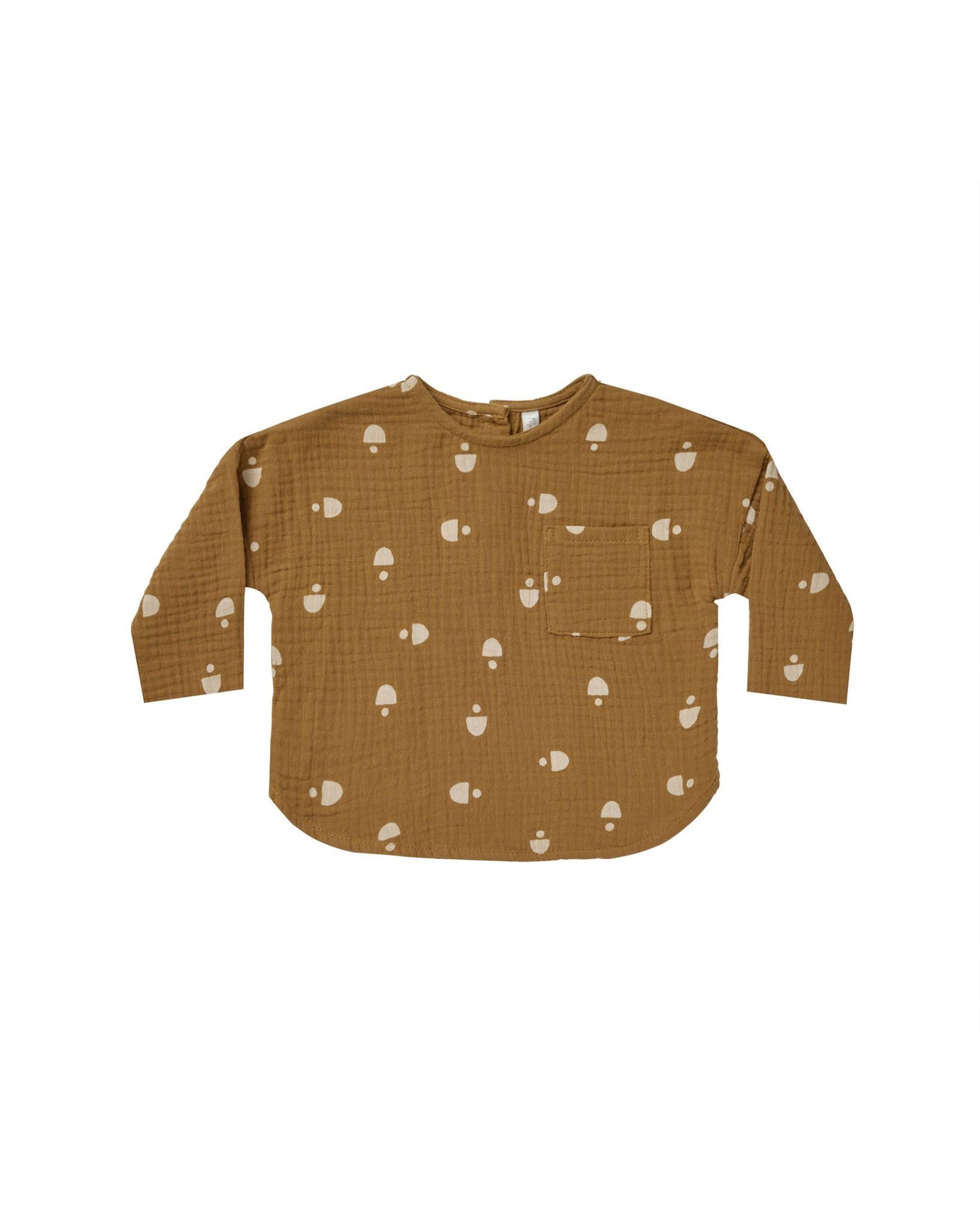 Longsleeve shirt with front pocket and coconut button back neck closure.