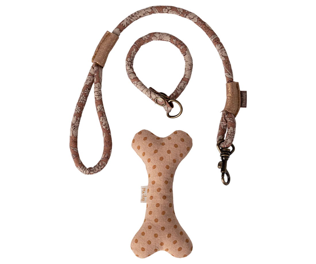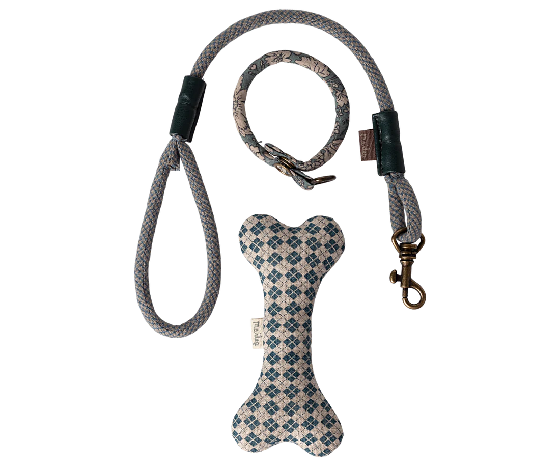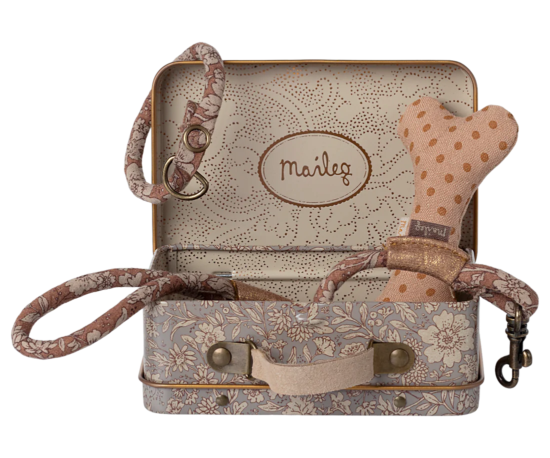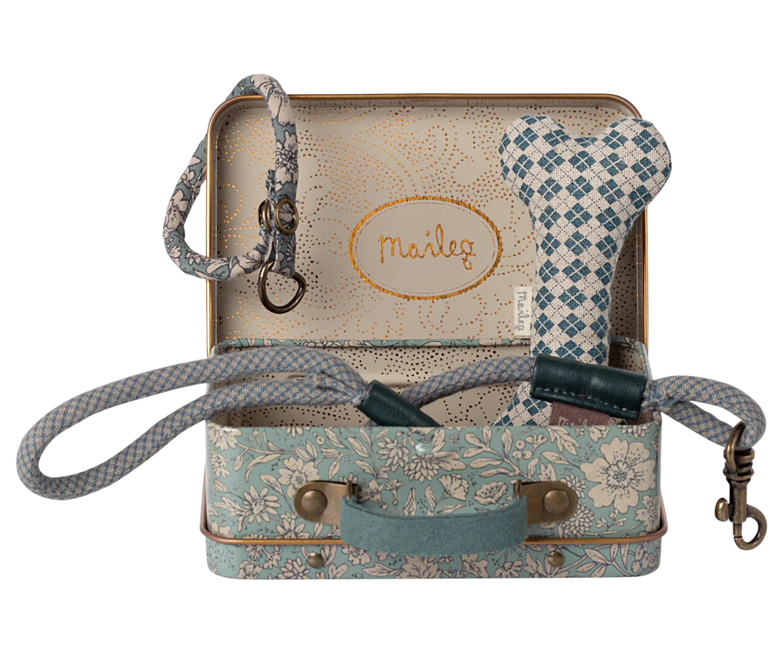 This set is all you need for your soft plush dog. The set includes a bone, collar and leash packed nicely in a metal suitcase with a beautiful Maileg print.