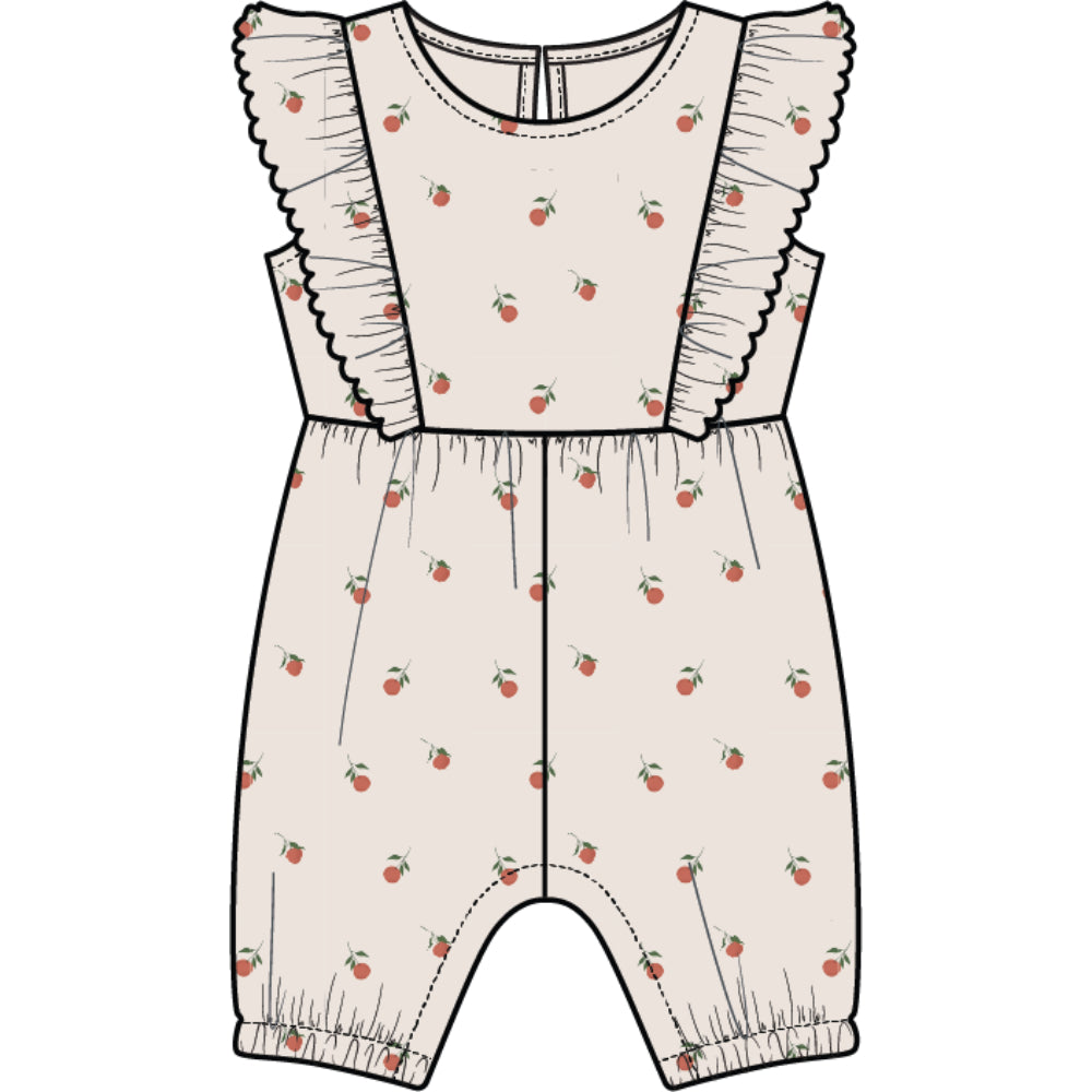 This charming little romper features our delicious all-over Oranges print and is finished with a flutter trim along both sides of the chest. With a tailored fit at the top and elastic in the legs, the romper has an overall puffed fit around her middle for total comfort throughout the day. It’s made from a light and breezy terry cloth to keep her cool while she plays. A loop button fastening at the back keeps the piece looking neat at the front while making dressing and changing a little easier. There’s matching pieces for big sis, so they can look fresh and sweet on a family day out.