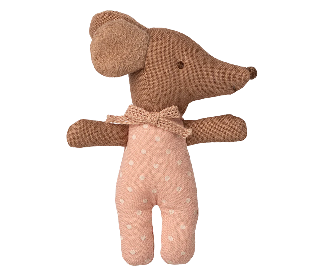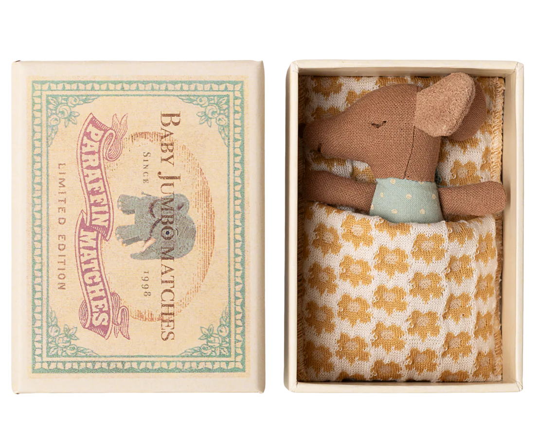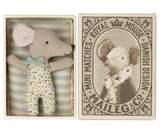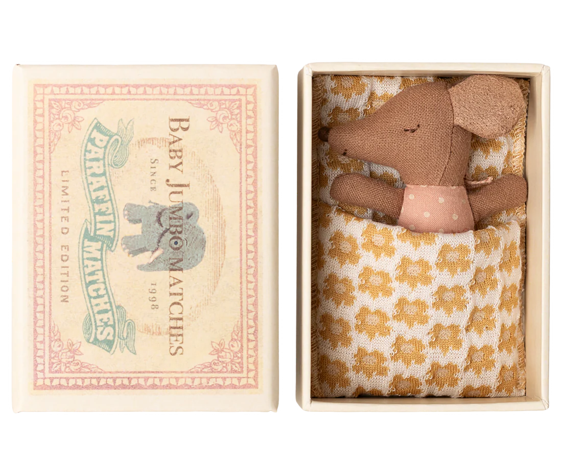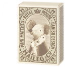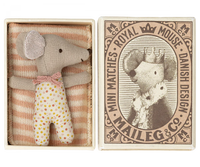 A classic Maileg item. This mouse is ready for hours of play and sleeps tight in the little matchbox. The clothes and bedlinen are made of soft fabrics with unique prints and beautiful colors.