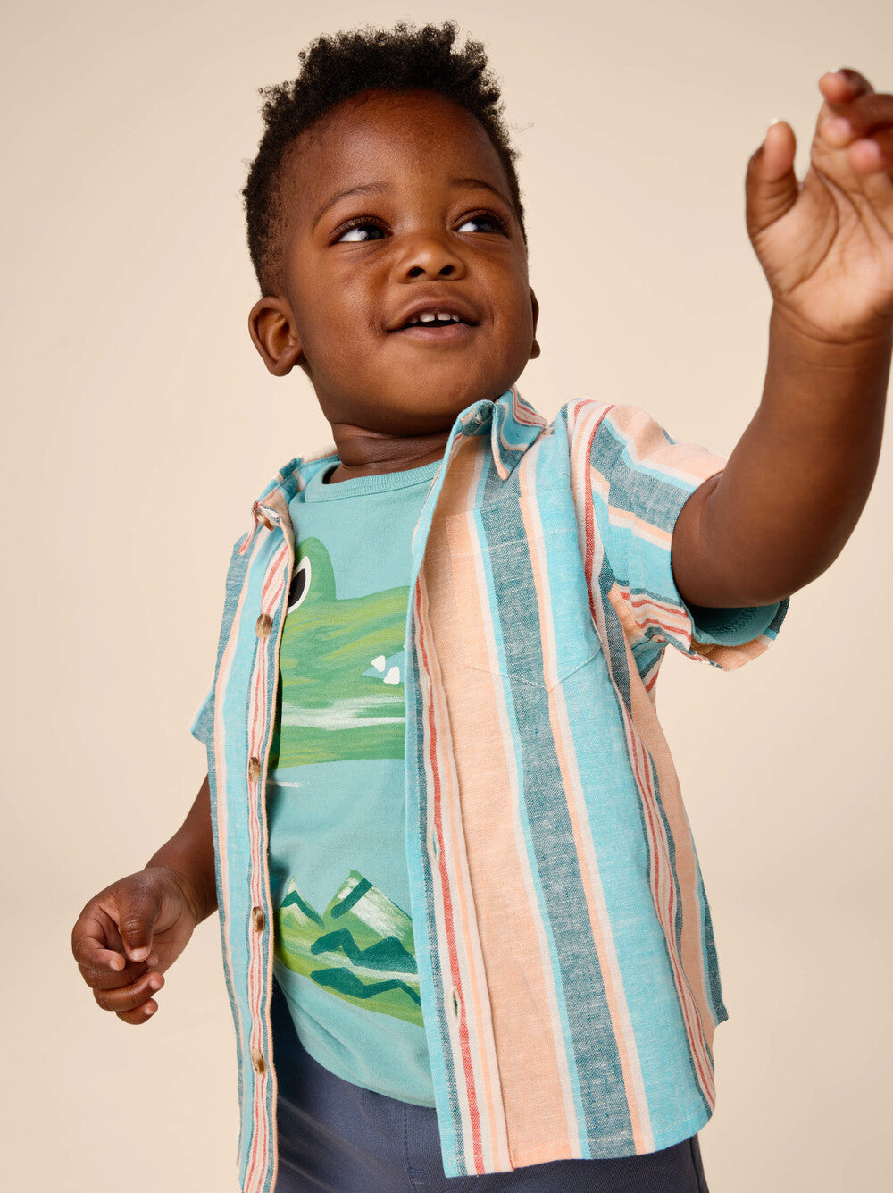 Dressy and fun, this striped button up shirt is crafted of a breathable and lightweight linen/cotton blend. Our in-house designers took care to create the perfect short-sleeve summertime shirt loaded with special detailing like a chest patch pocket, center front button closure, and a spare button. Paired with our shorts, your little one will be instantly ready for play and parties. Thigh length.